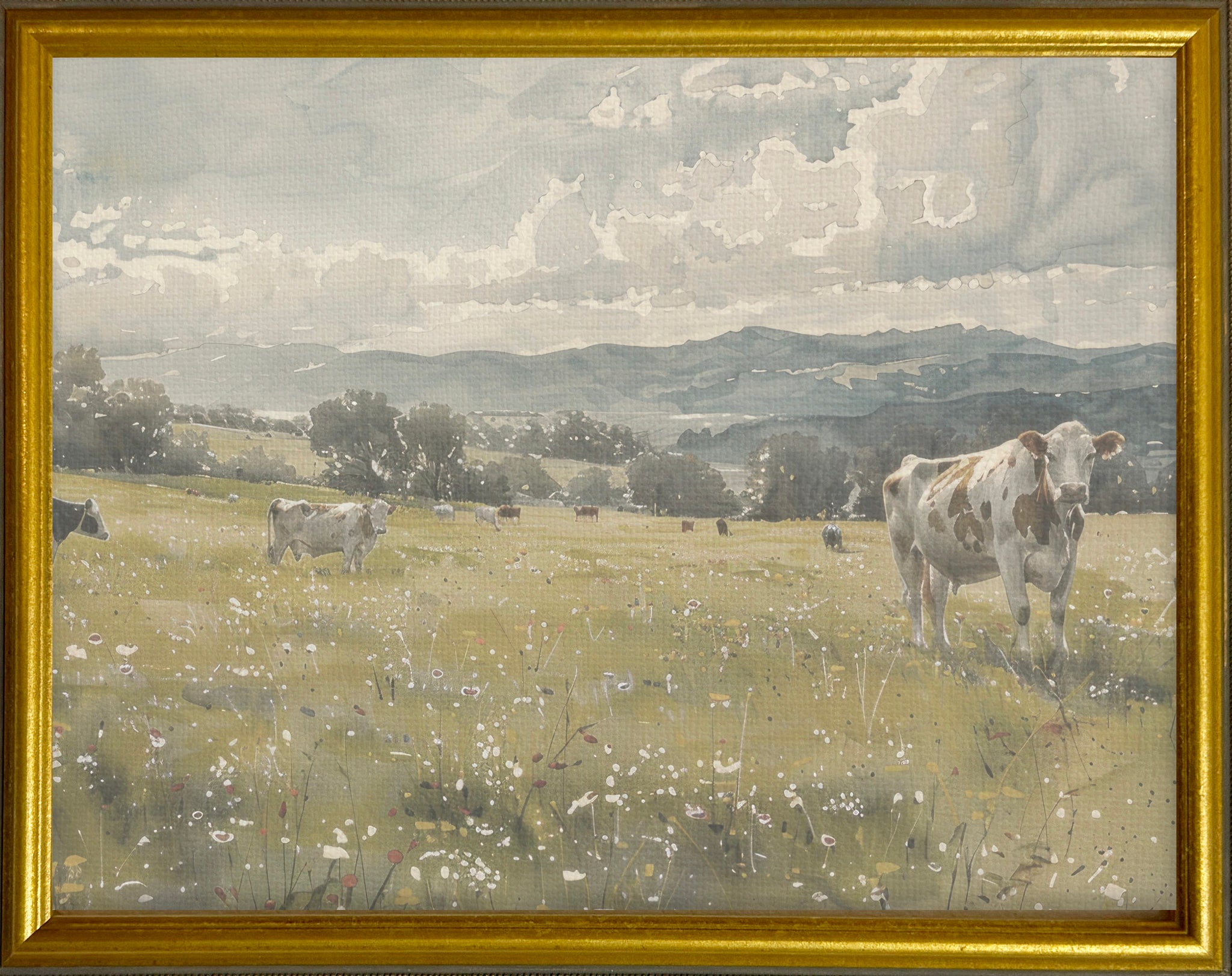 Our Country Cows printed on raw natural canvas giving it a time worn look - Framed in our Gold Gallery Frame - approximately 16x20.
