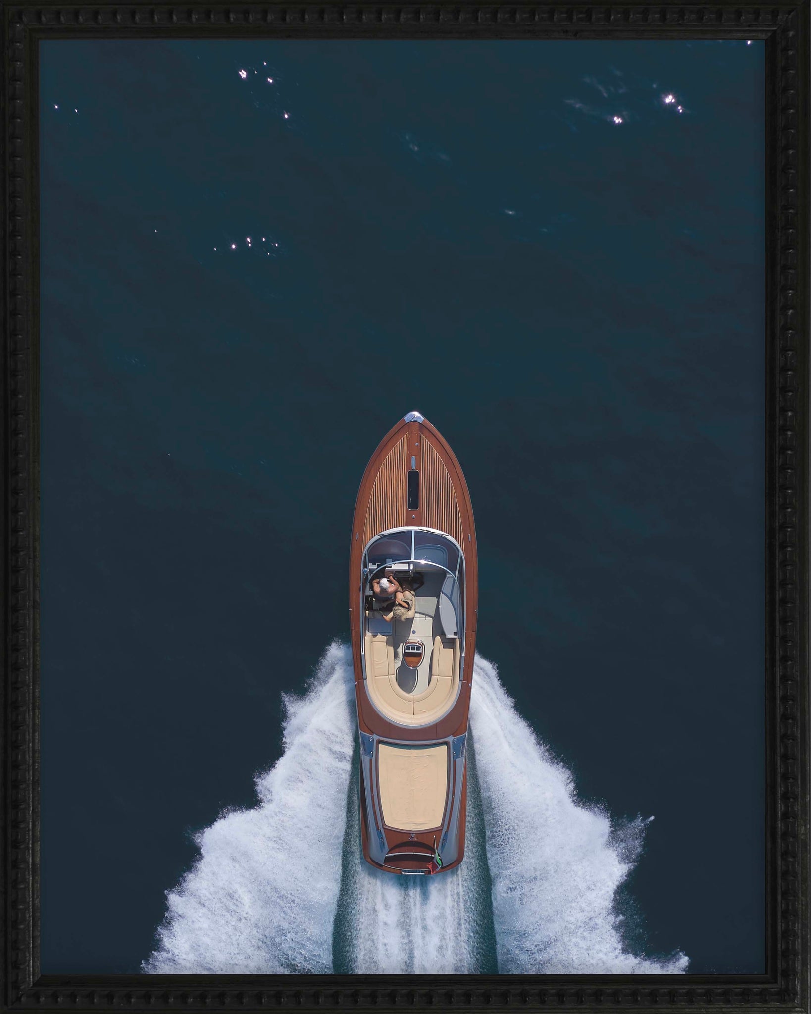 Our Speedboat printed on raw natural canvas giving it a time worn look - Framed in our Black Beaded Gallery Frame - approximately 16x20.