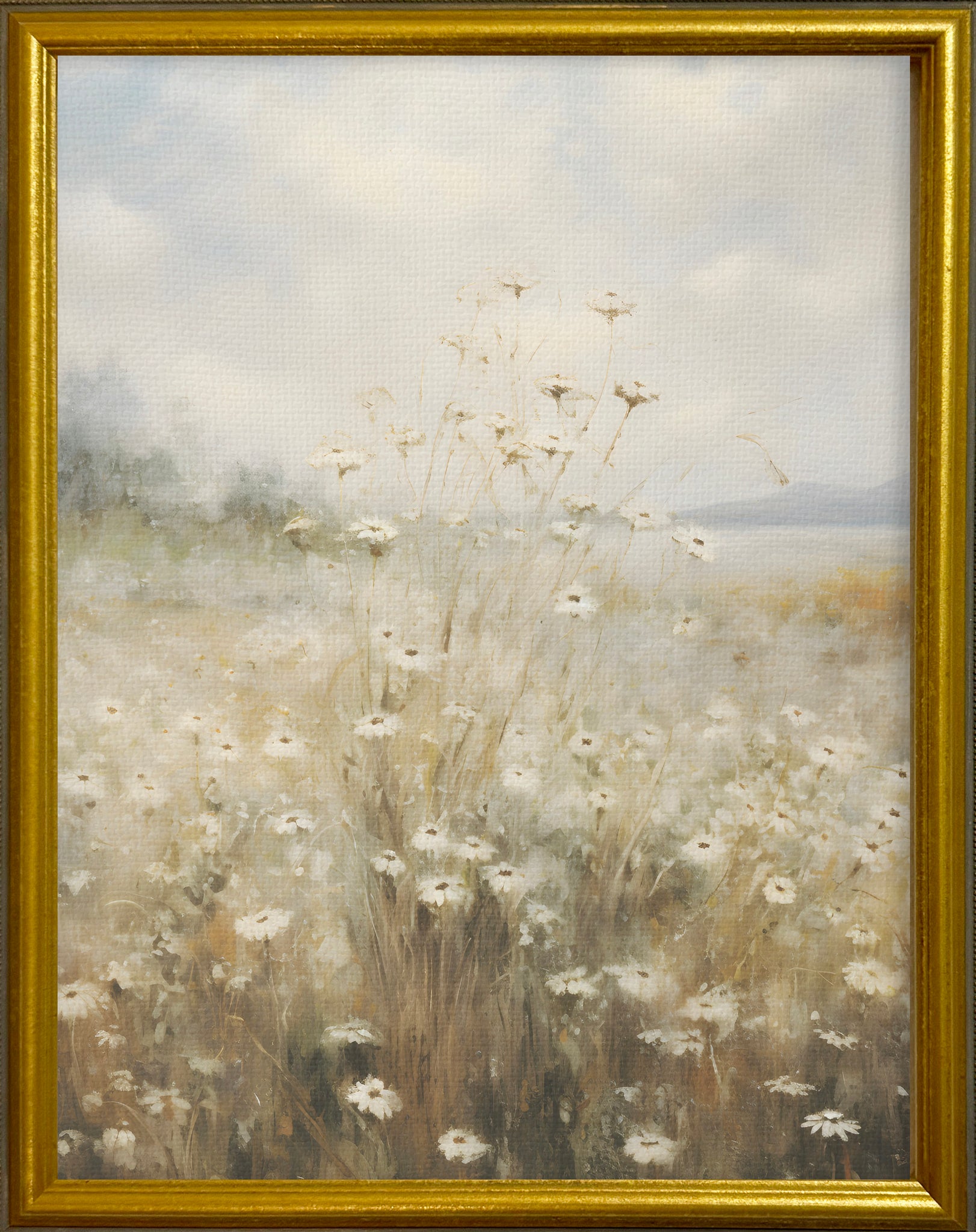Our Field of Flowers printed on raw natural canvas giving it a time worn look - Framed in our Gold Gallery Frame - approximately 16x20.